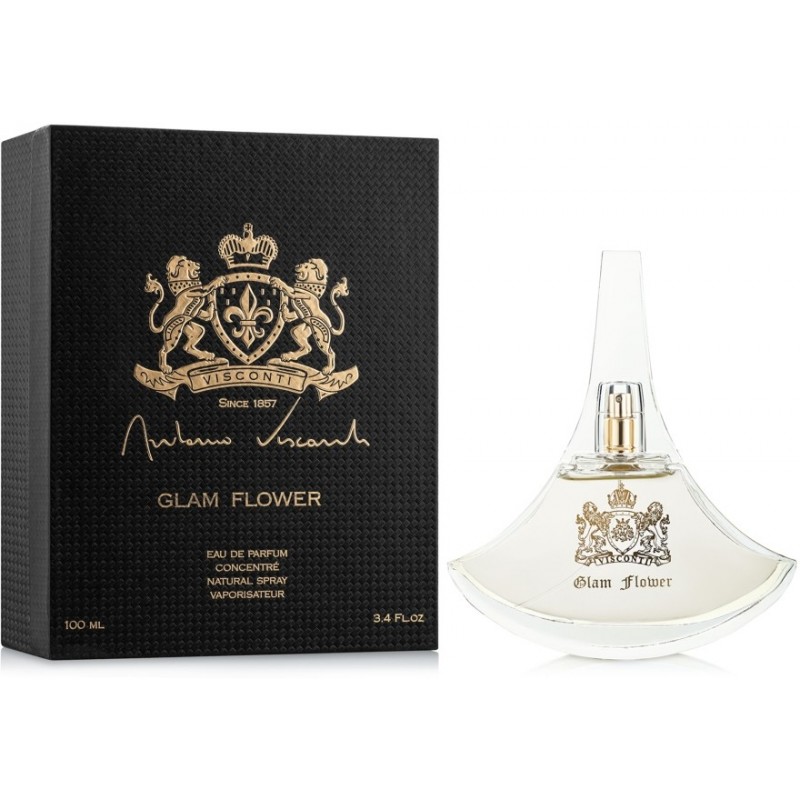 Glam Flower by Antonio Visconti Perfume. Gorgeous golden tones of honey illuminate sparkling fruits and lend sweet profusion to scented blooms in Glam Flower, a mesmerizing fresh floral fragrance. The opening is a crystalline effusion of bergamot and burgundy grapes sparkling with airy, almost metallic nuances of crushed lime. Lush, tropical tiare flower and effusive Damask rose flourish at the heart, pricked with green, aqueous hints of violet leaf and warmed with tones of honey and coconut. Base notes of soft sandalwood, earthy, enveloping patchouli, amber and sheer white musk produce a magnetic, lingering finish that beautifully balances the brightness of the introduction.