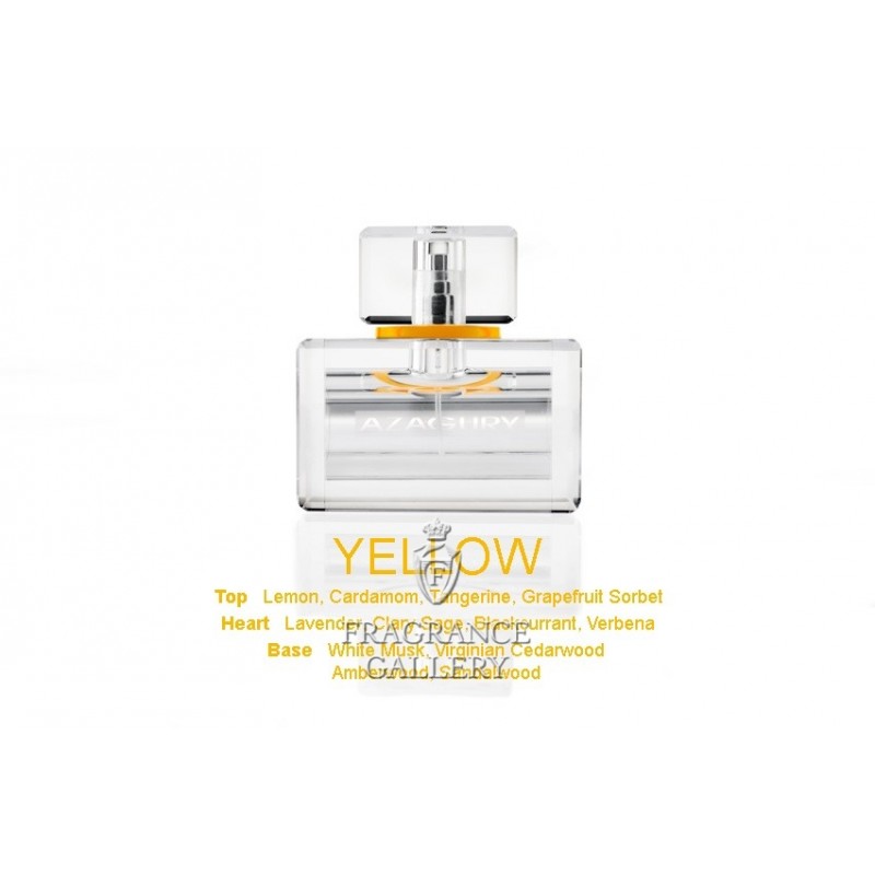 AZAGURY YELLOW - свет, энергия, инновация, изменения, пульс. Верхние ноты: лимон, кардамон, мандарин, грейпфрутовый сорбет. Ноты сердца: лаванда, мускатный шалфей, черная смородина, вербена. Ноты базы: белый мускус, виргинский кедр, amberwood, сандал.